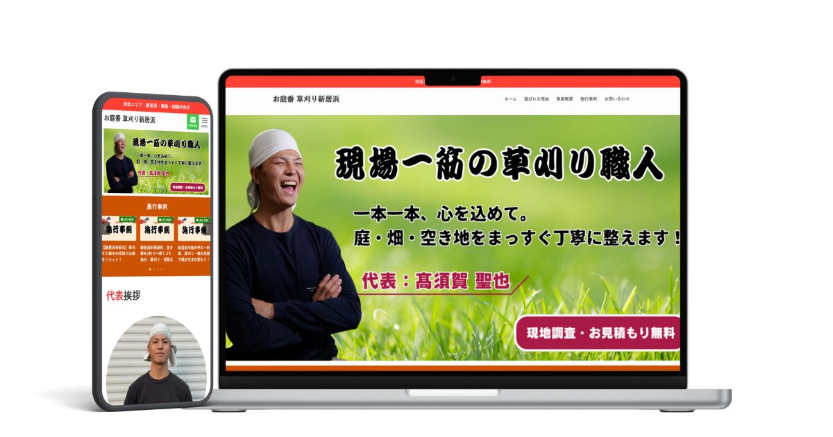 草刈り業者というと「作業着の業者」というイメージがありますが、お庭番様は「顔の見える、安心して頼める存在」として差別化を図りました。代表の髙須賀様の写真と挨拶文をトップページに大きく配置し、人柄や想いが伝わるデザインを採用しています。