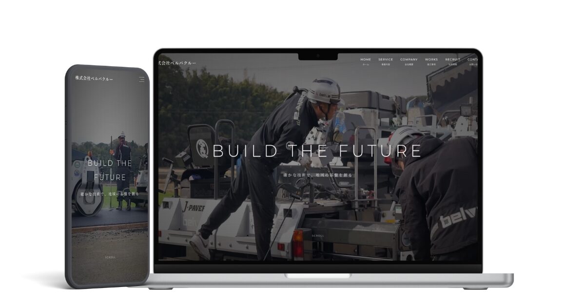 西条市にて土木工事・舗装工事を手がける「株式会社ベルバクルー」様より、コーポレートサイトの新規制作をご依頼いただきました。地域のインフラを支える確かな技術と、若手育成・採用強化への想いを、黒をベースとした重厚感あるオリジナルデザインで表現しています。